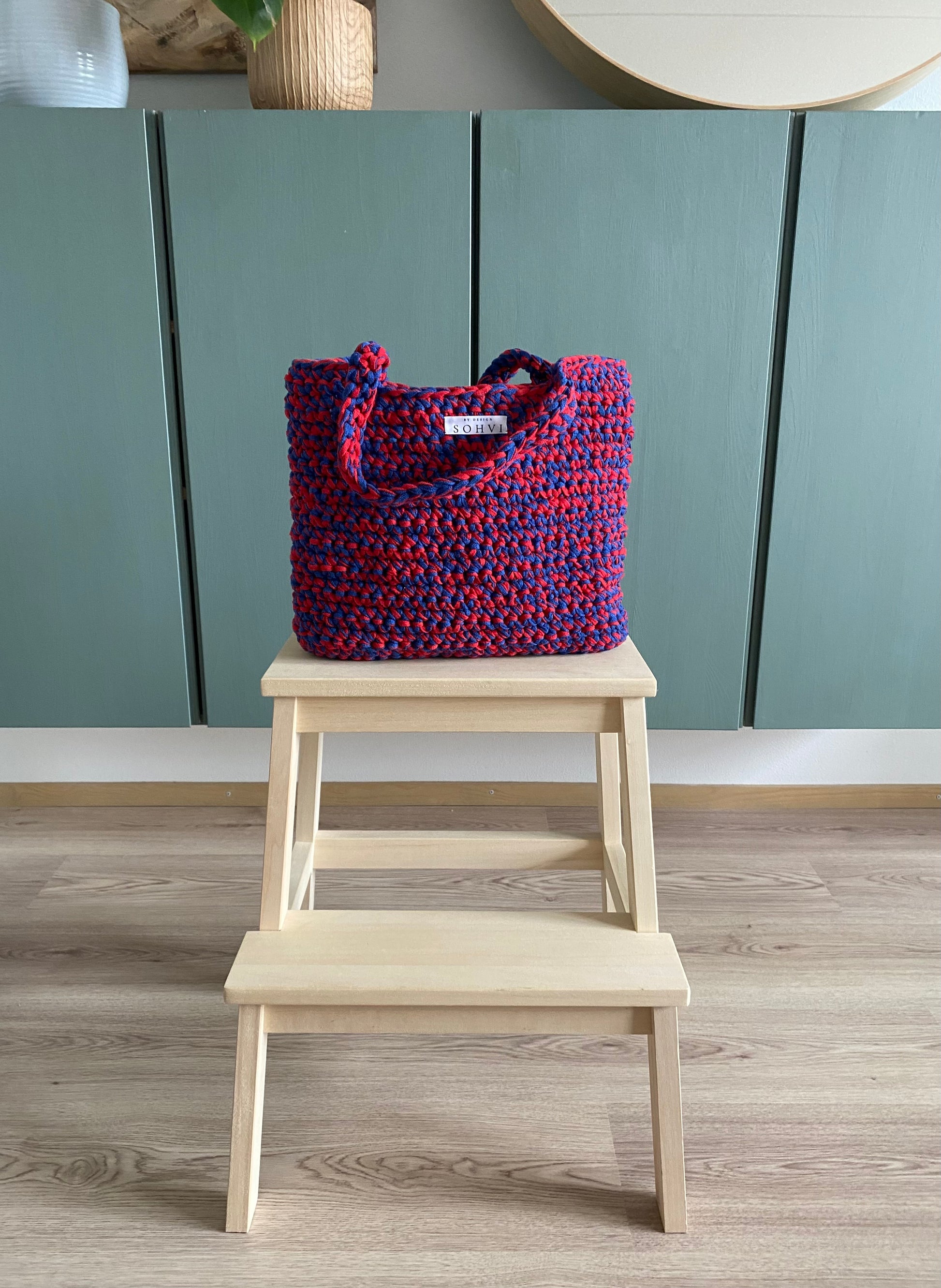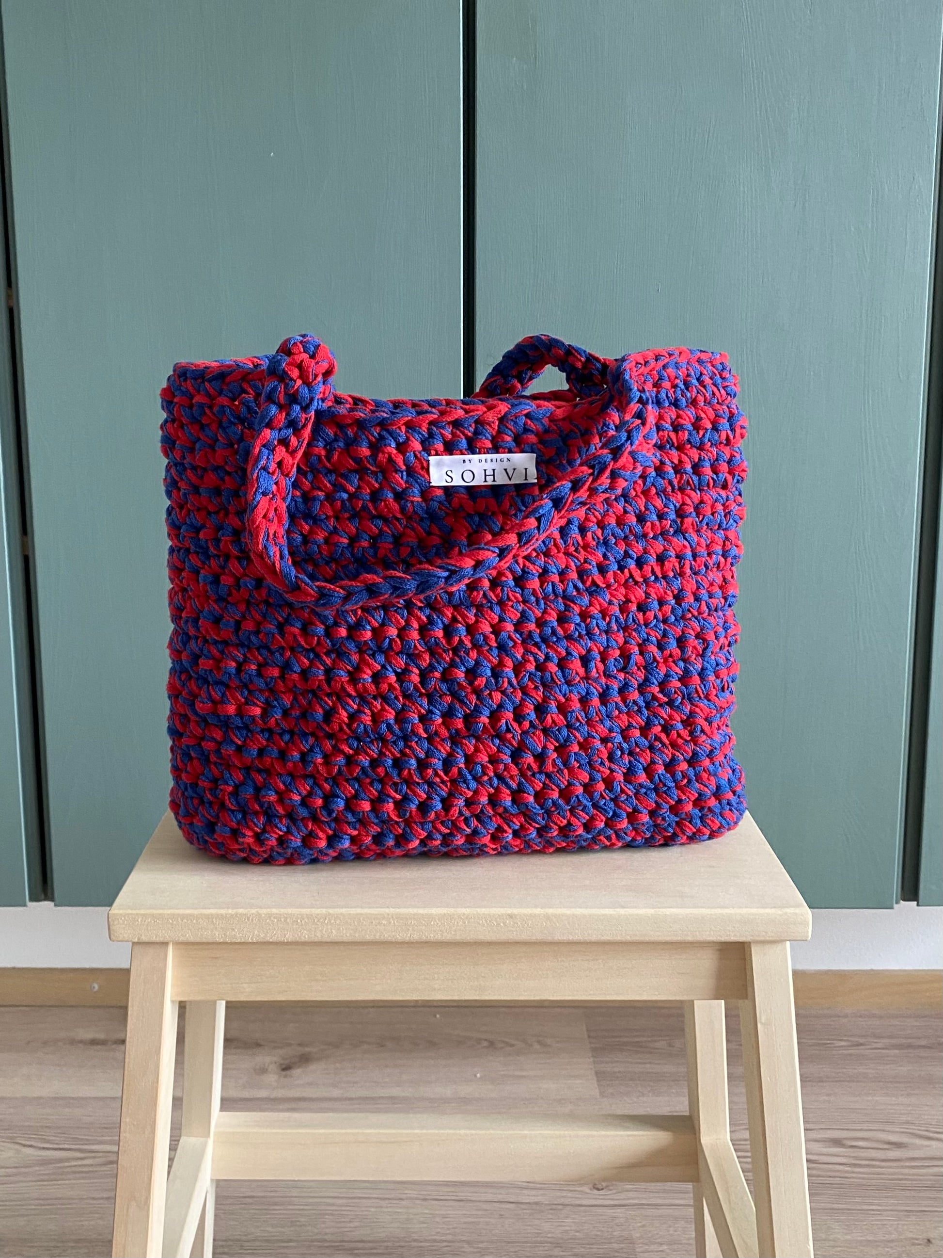 SOHVI -bag on käsin virkattu kestävästä kierrätysmateriaalista. Laukku on tehty ontelokuteesta, joka valmistetaan trikooteollisuuden ylijäämäästä.
