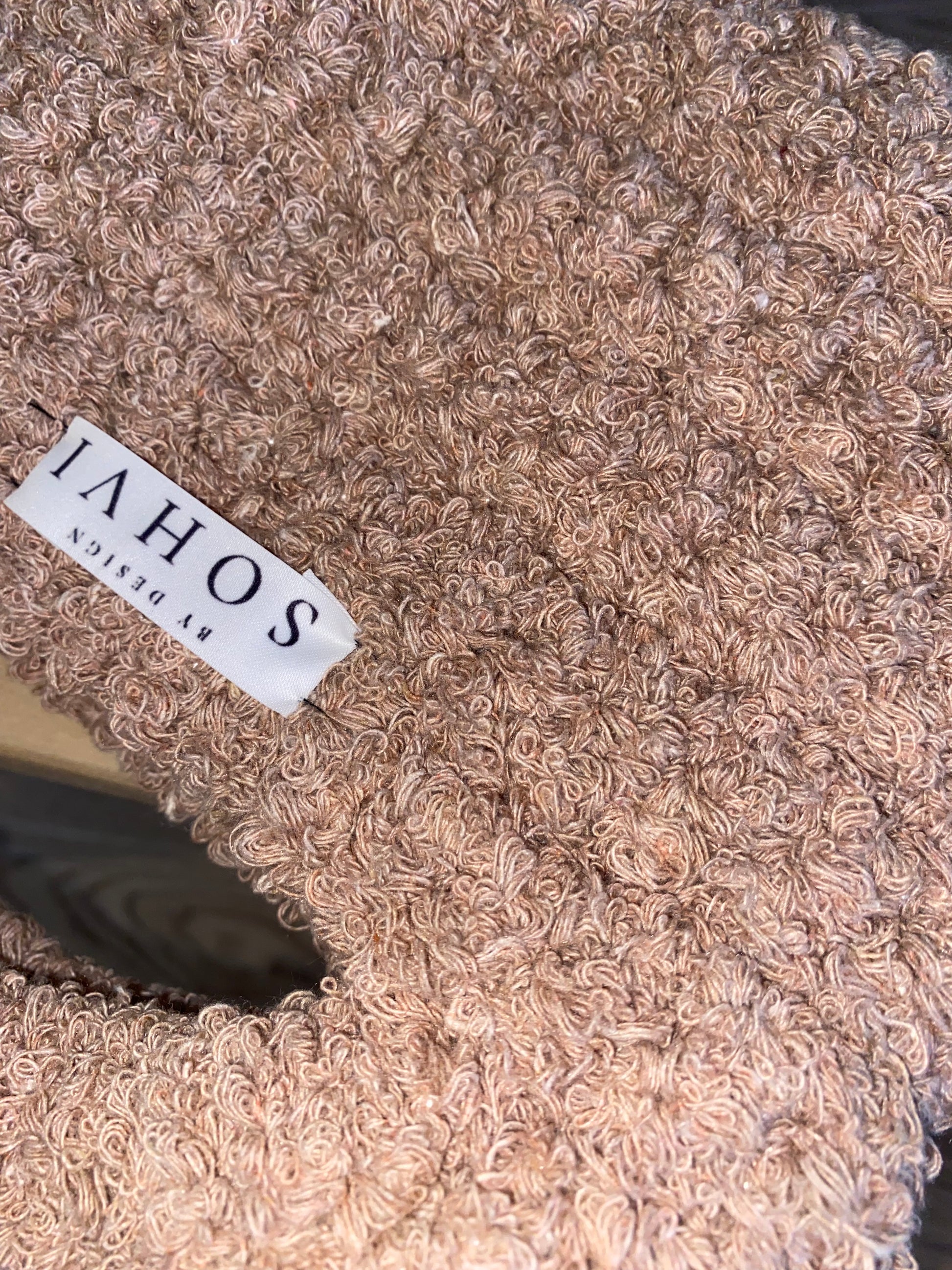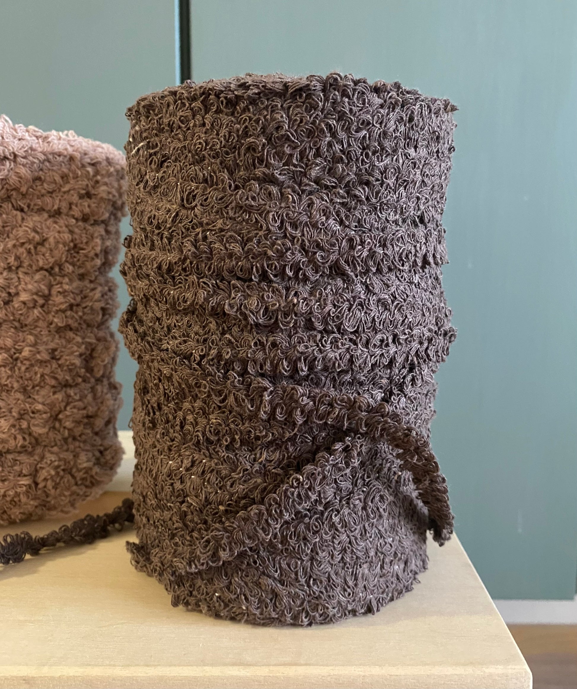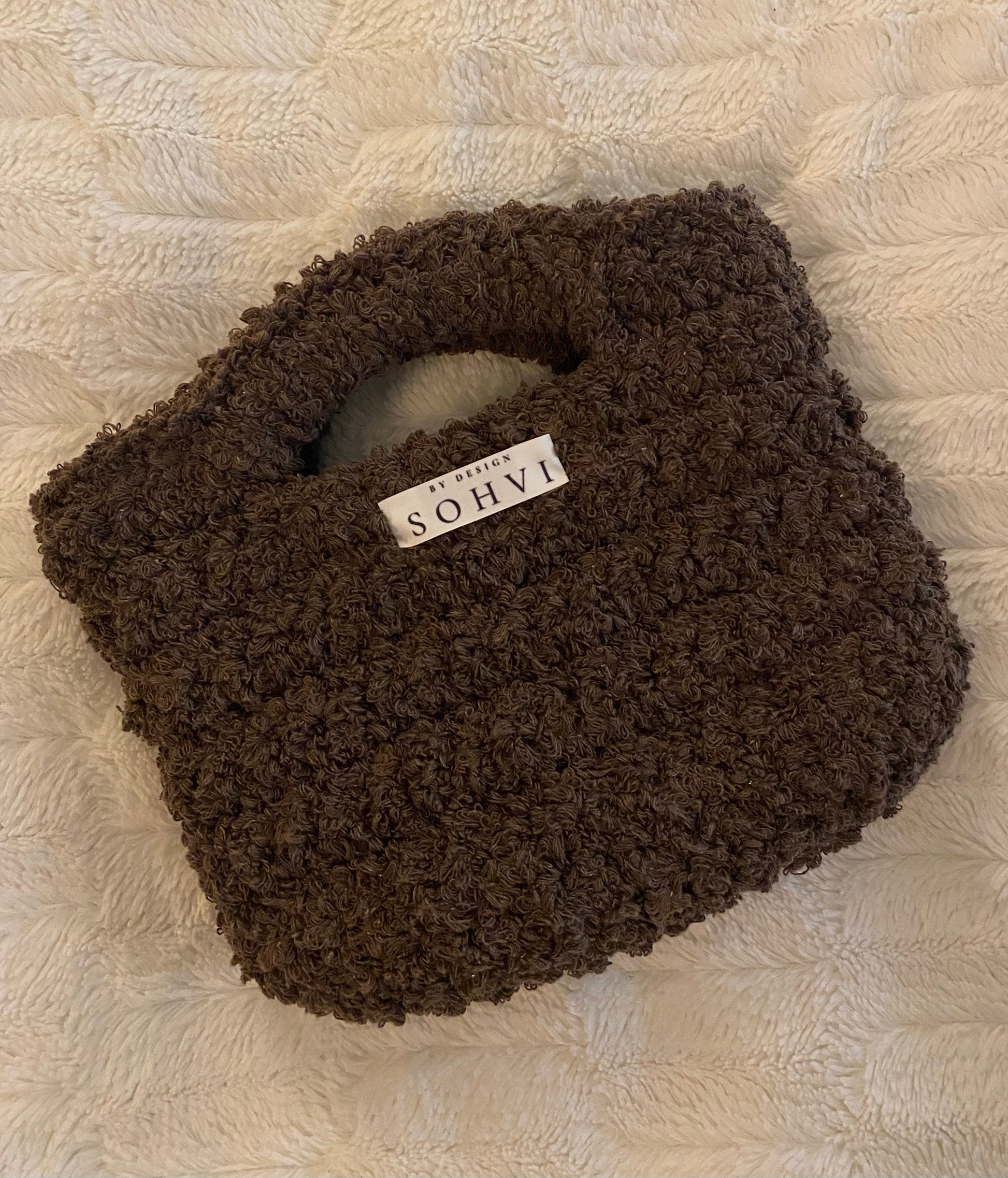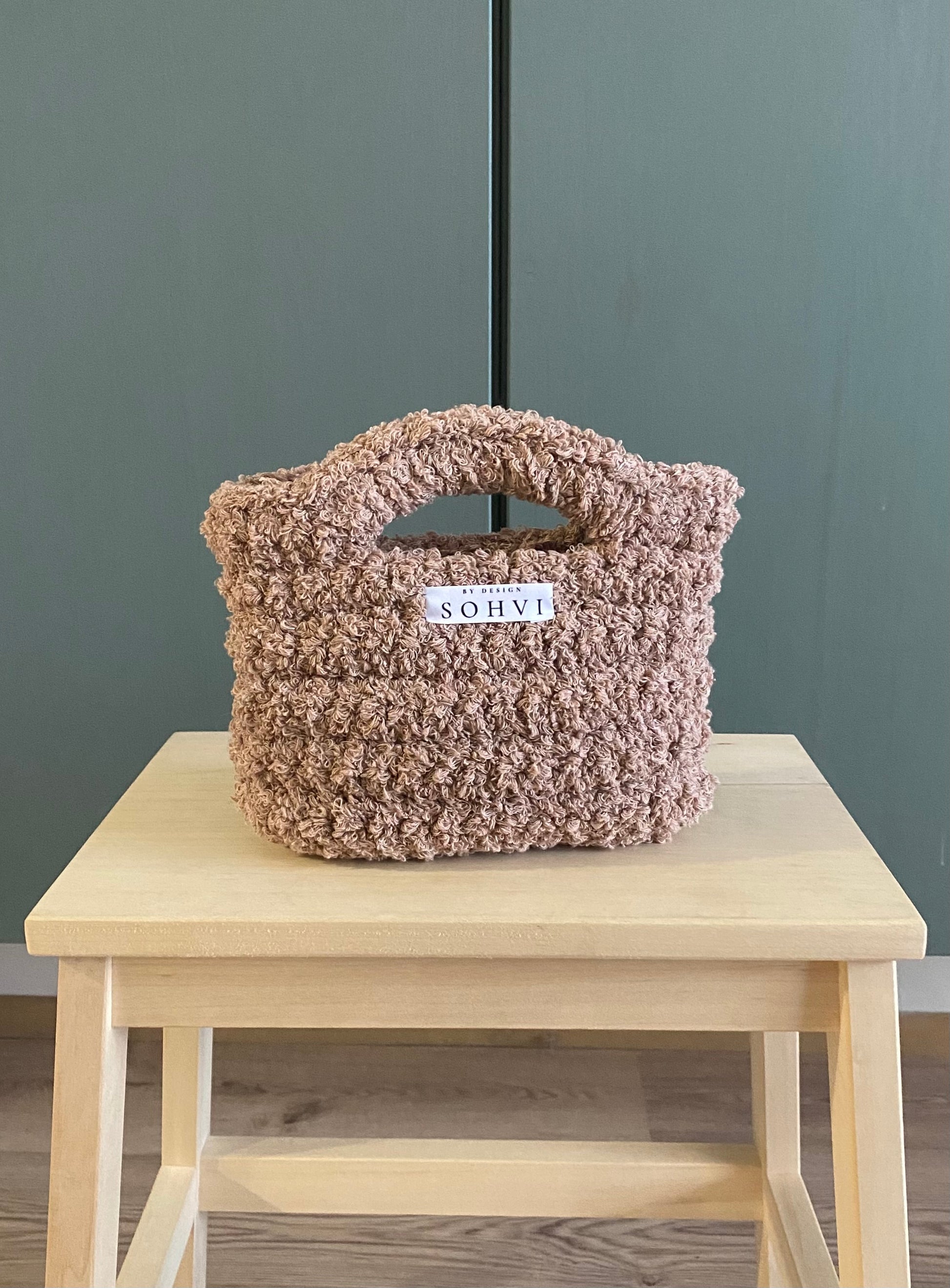 UUTUUS! Valloittava pienempi uutuus, pörrö-SOHVI, on valmistettu tuttuun tapaan kierrätysmateriaalista. Pörröinen pieni käsilaukku on pyyhkeistäkin tuttua froteeta, eli se on virkattu pieniä langansilmukoita täynnä olevasta froteelangasta.