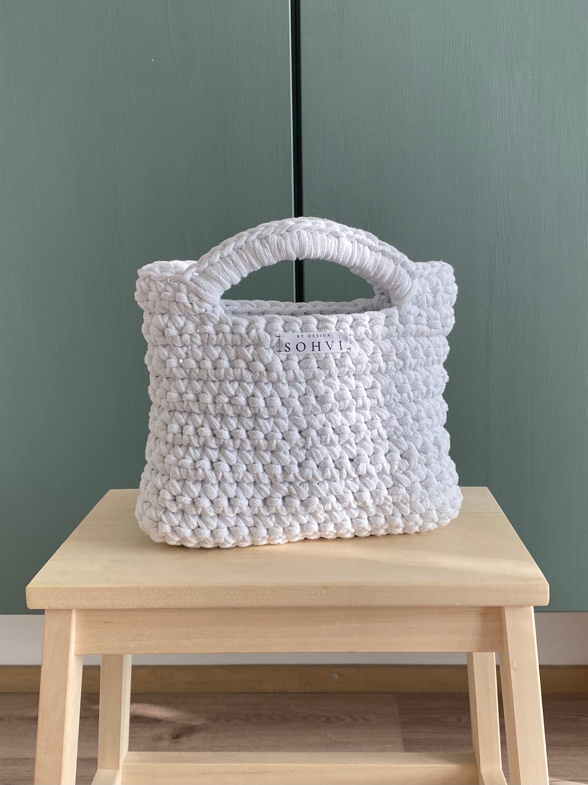 SOHVI -bag on käsin virkattu kestävästä kierrätysmateriaalista. Laukku on tehty ontelokuteesta, joka valmistetaan trikooteollisuuden ylijäämäästä.