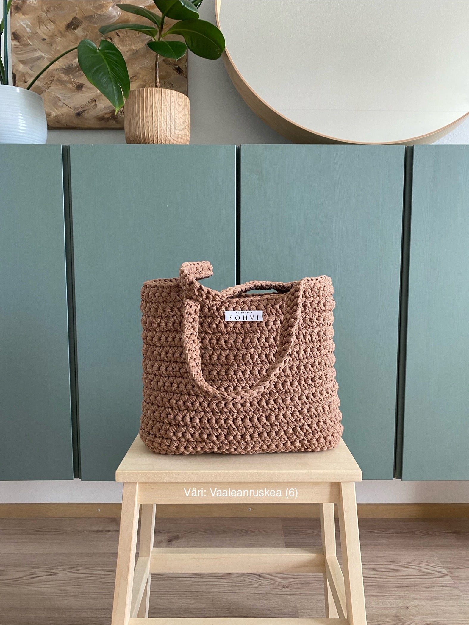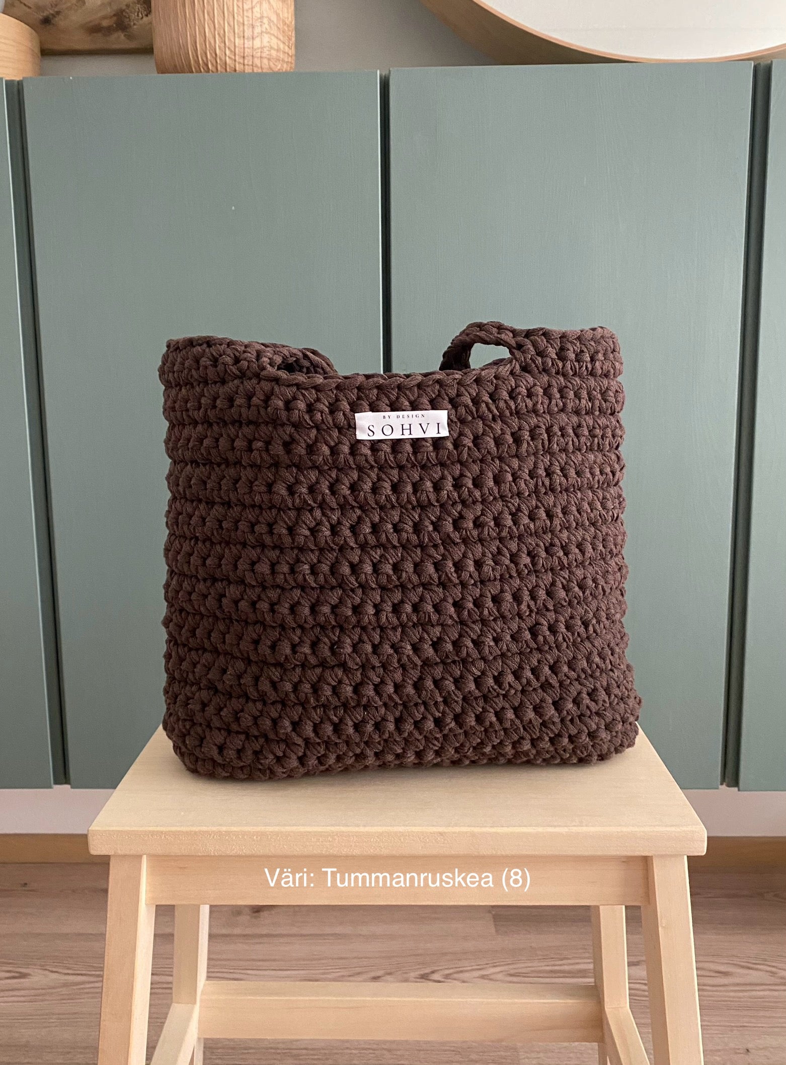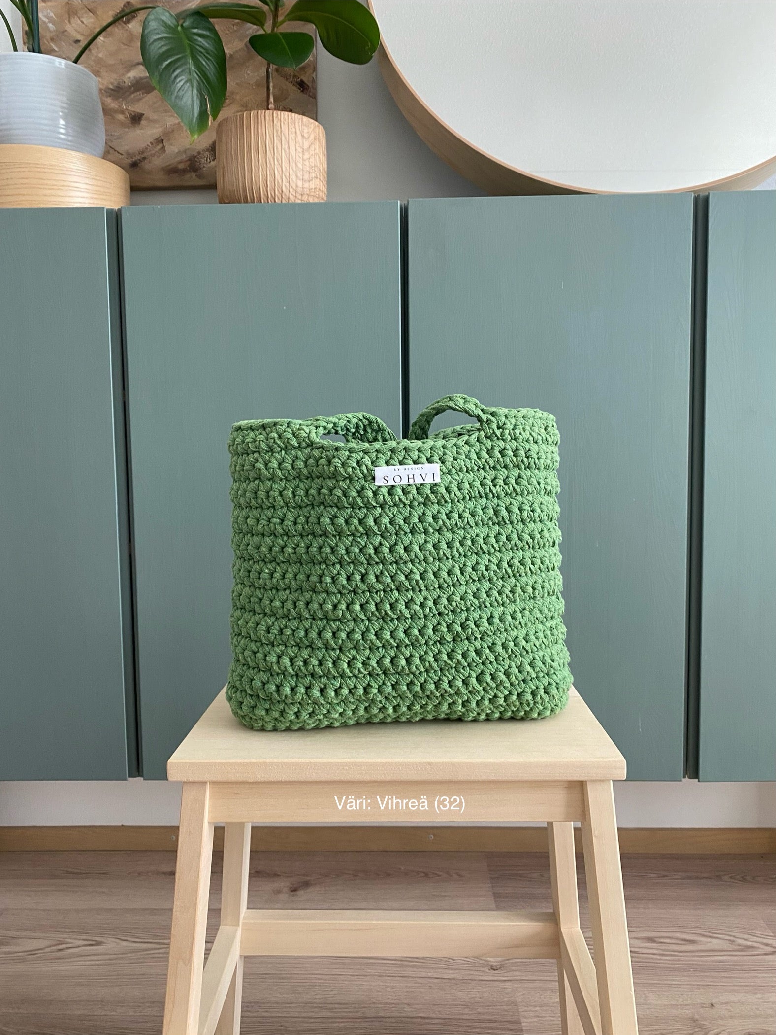 Perustiedot: Arki-SOHVI on käsin virkattu kestävästä kierrätysmateriaalista. Laukku on tehty ontelokuteesta, joka valmistetaan trikooteollisuuden ylijäämäästä.