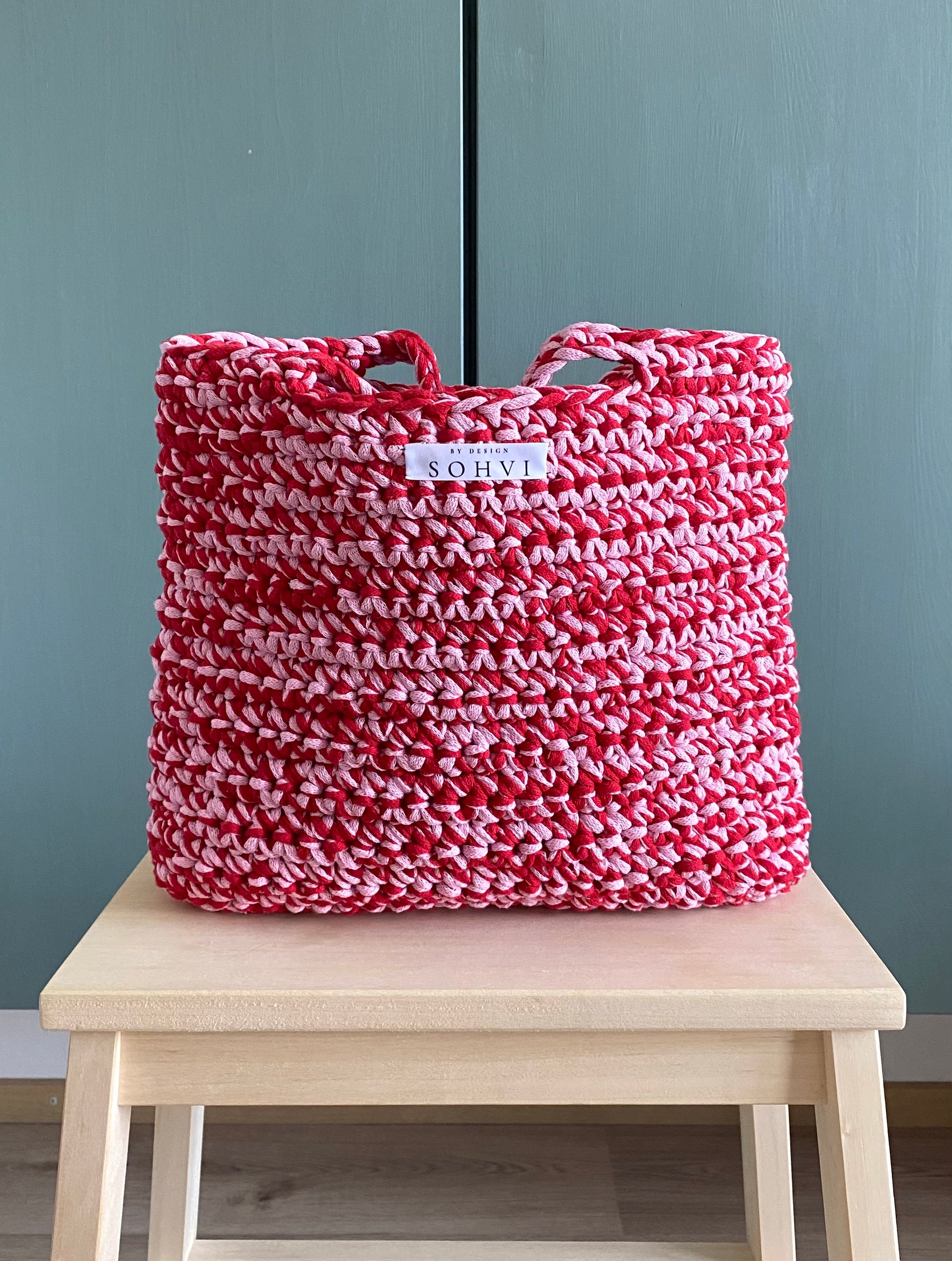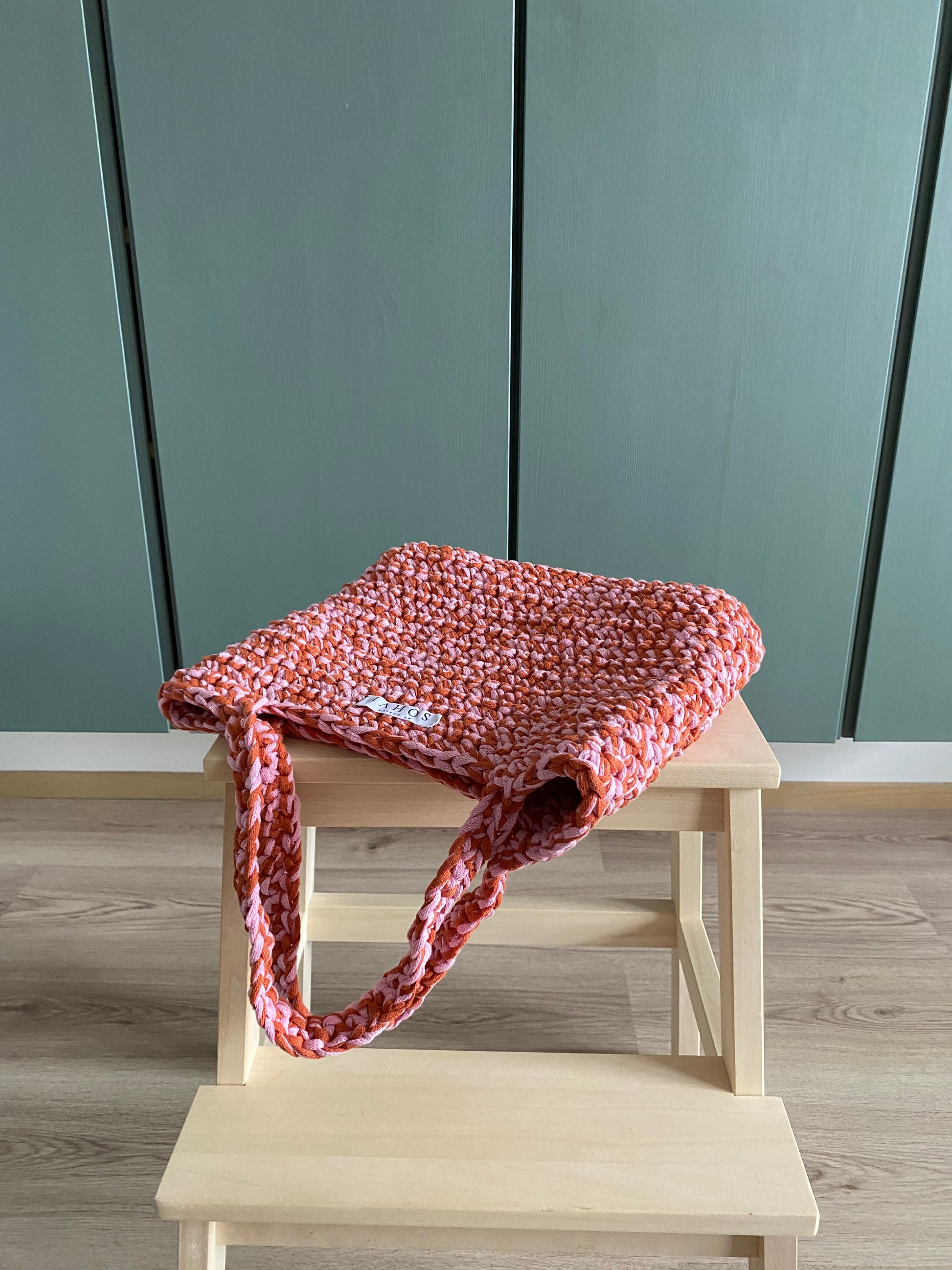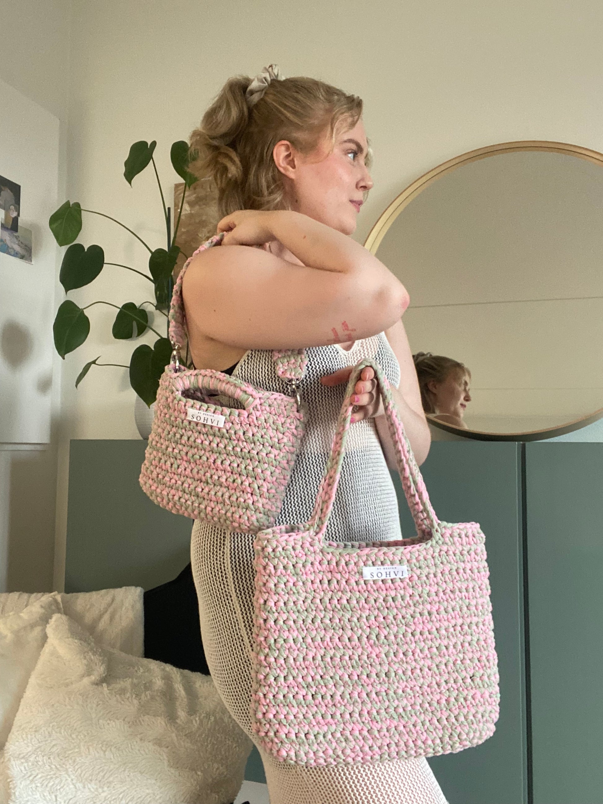 Perustiedot: Kaikki mallit on käsin virkattu kestävästä kierrätysmateriaalista. Laukku on tehty ontelokuteesta, joka valmistetaan trikooteollisuuden ylijäämäästä.
