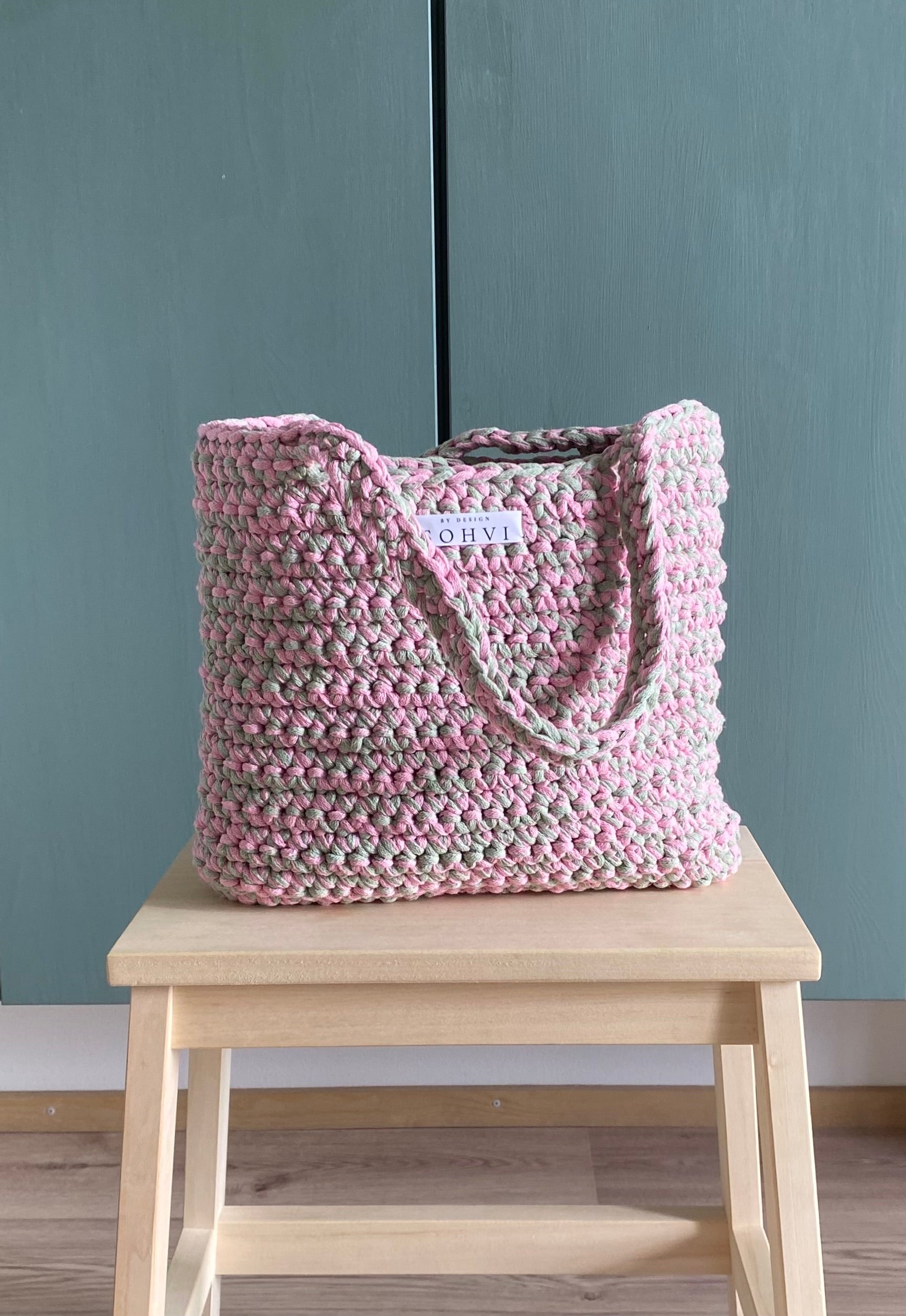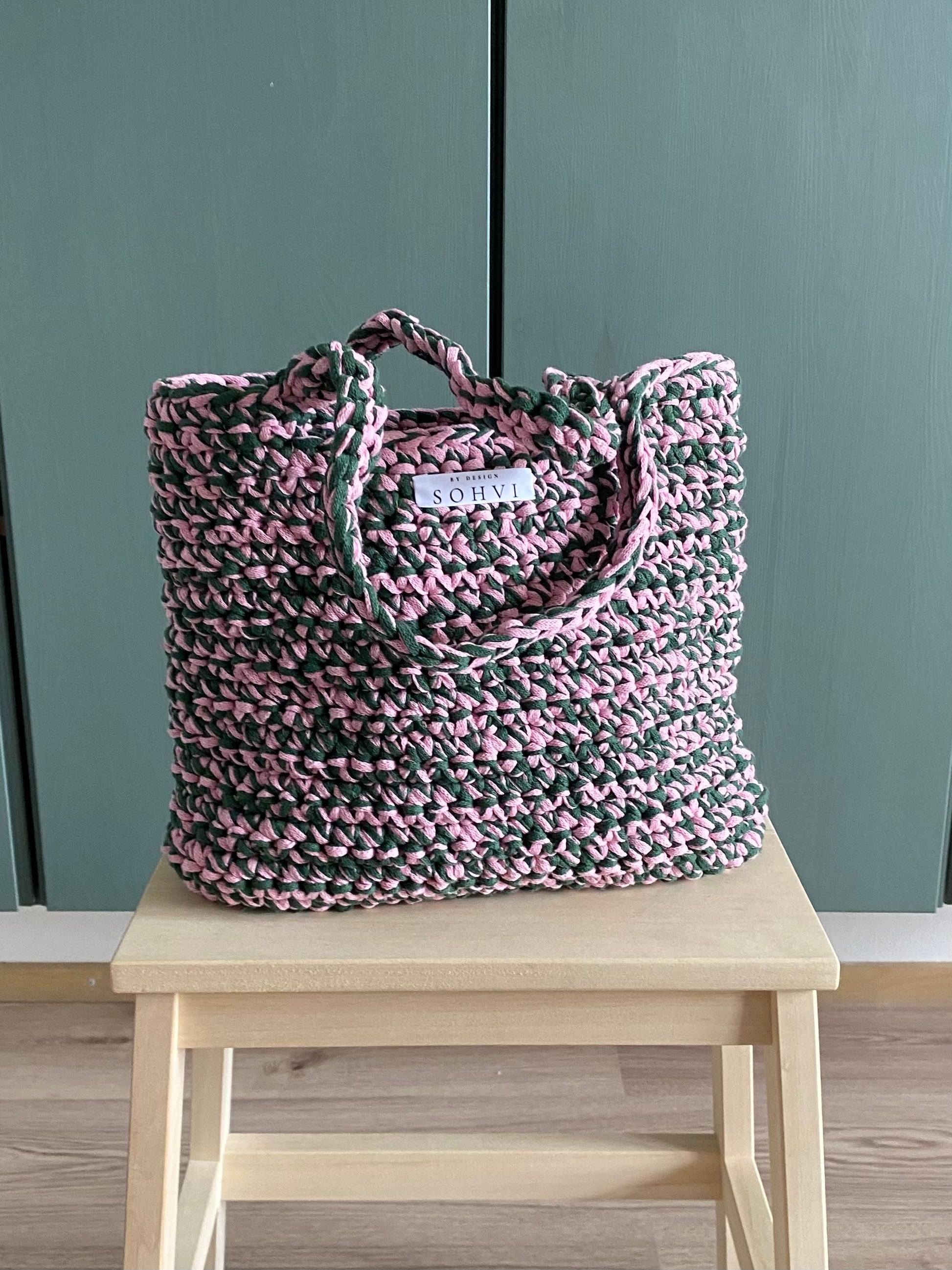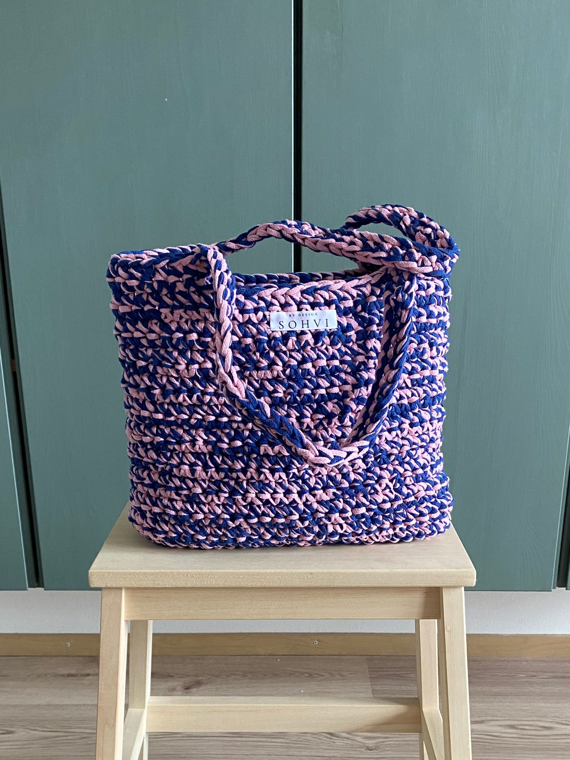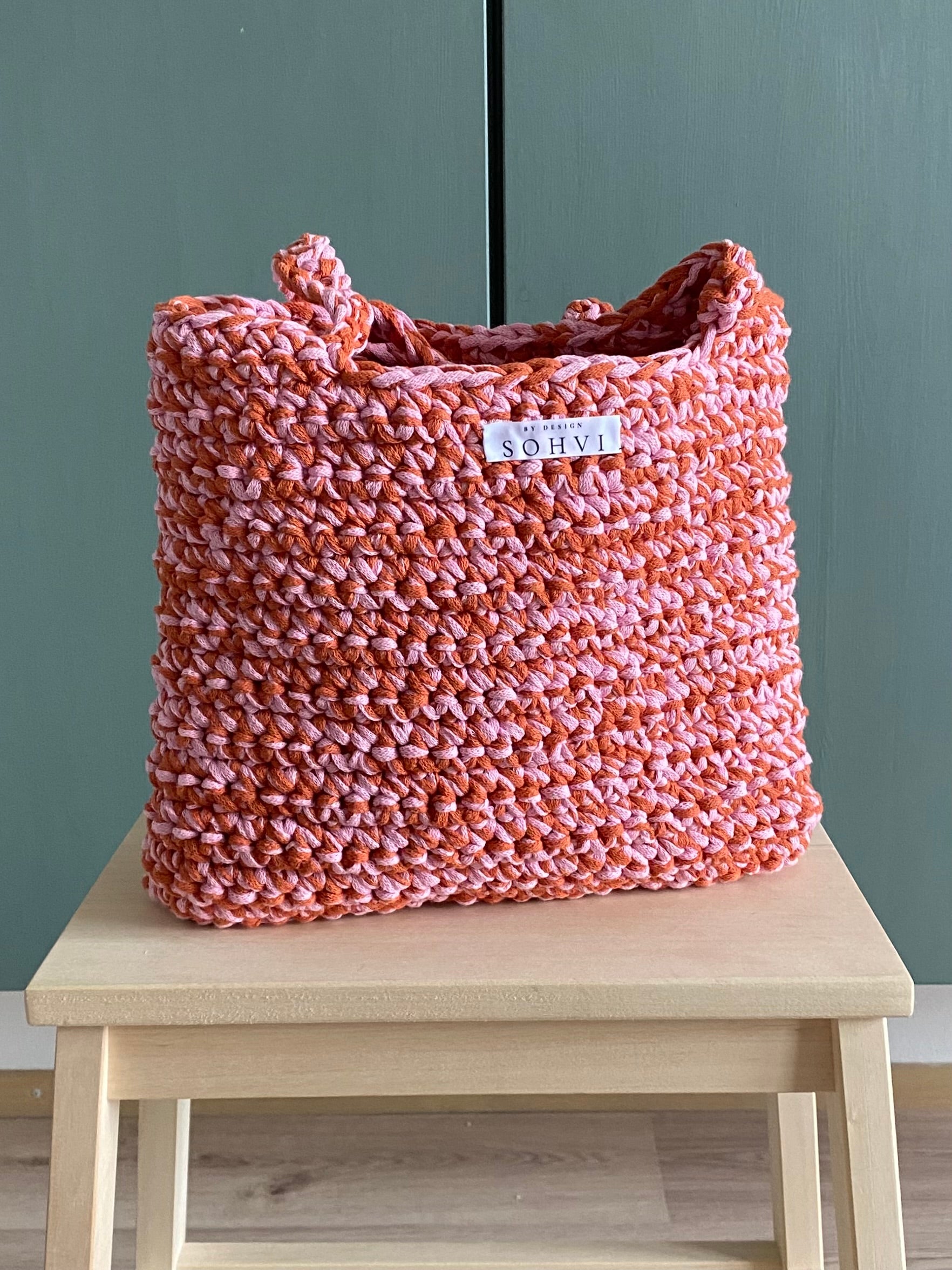 Perustiedot: Kaikki mallit on käsin virkattu kestävästä kierrätysmateriaalista. Laukku on tehty ontelokuteesta, joka valmistetaan trikooteollisuuden ylijäämäästä.