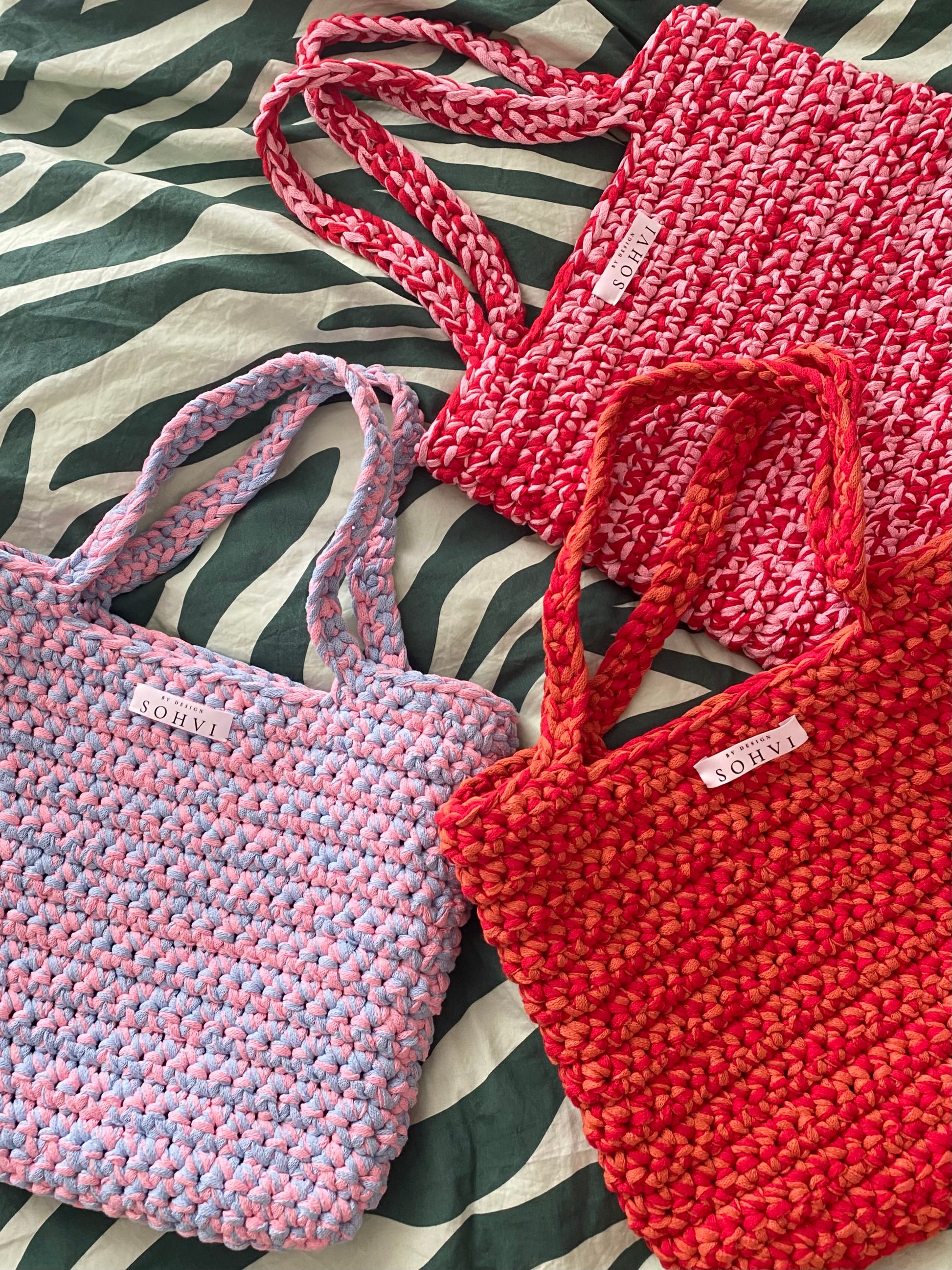 Kaksiväriset SOHVI-laukut on kaikki virkattu tavanomaista ohuemmasta ontelokuteesta kaksin kerroin, kahta eri väristä lankaa käyttäen.